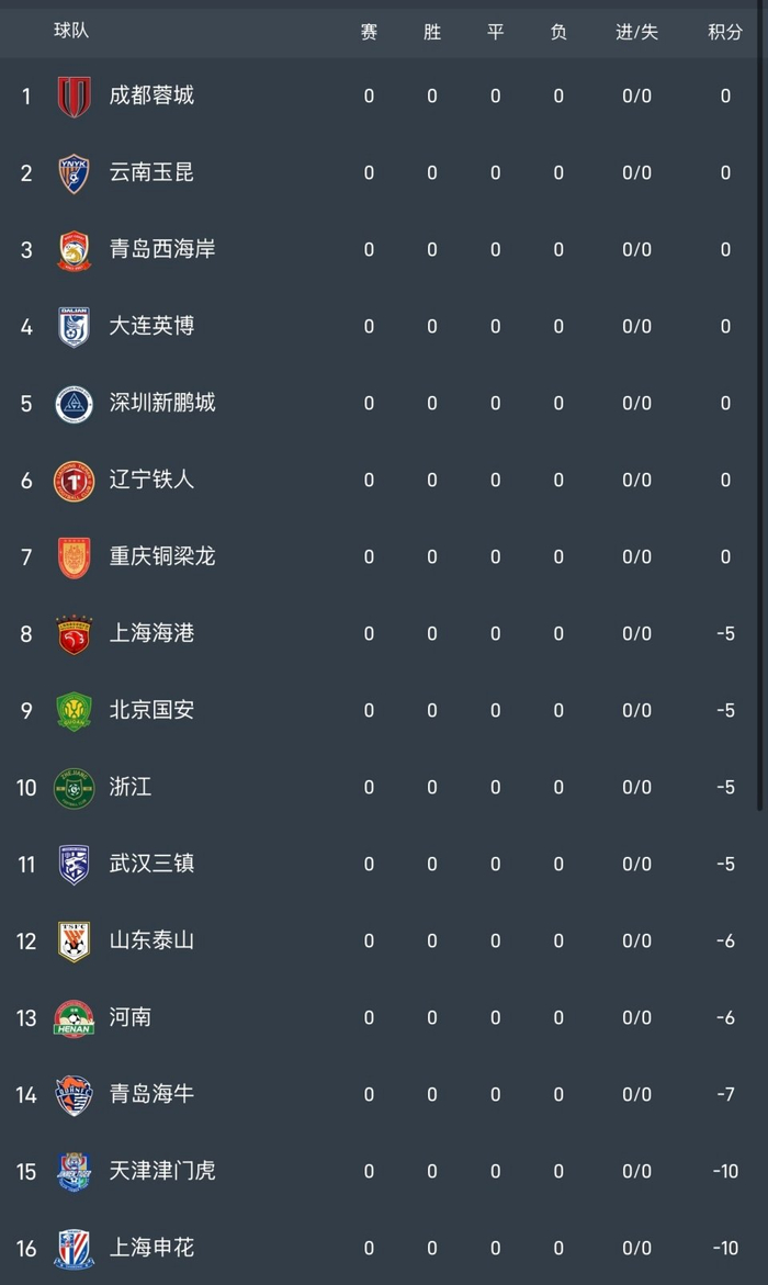 成都蓉城、云南玉昆、青岛西海岸、大连英博、深圳新鹏城、辽宁铁人、重庆铜梁龙都是0分开局。而按2025赛季的成绩排名,那就是上赛季第3成都蓉城位居榜首,上赛季第8云南玉昆排名第二。