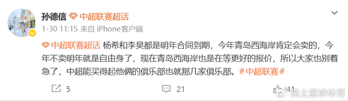 孙德信在社媒上表示:杨希和李昊都是明年合同到期,今年青岛西海岸肯定会卖的!今年不卖明年就是自由身了,现在青岛西海岸也是在等更好的报价,所以大家也别着急了,中超能买得起他俩的俱乐部也就那几家俱乐部。