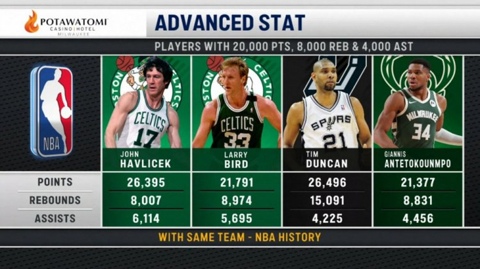 仅4人为同队砍2万分8000板4000助!哈弗里切克&伯德&邓肯&字母哥