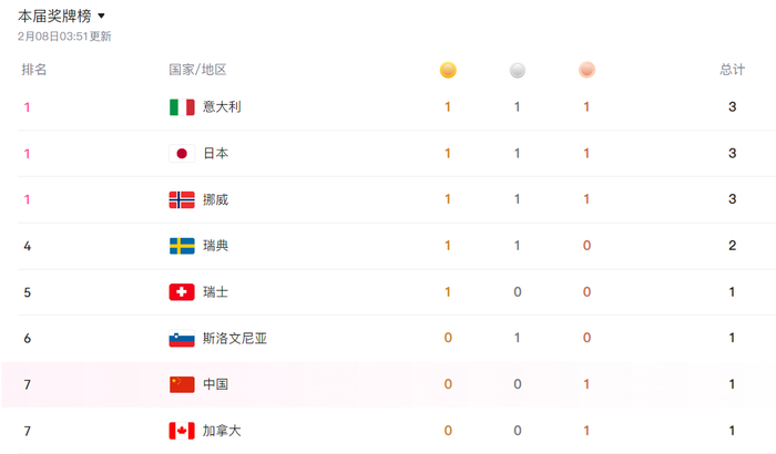 北京时间2月8日凌晨,米兰冬奥会结束了首个完整比赛日,总共诞生5枚金牌,最后被意大利、日本、挪威、瑞士、瑞典平分,中国代表团未能夺冠,依靠苏翊鸣的第三名获得一枚奖牌,位列金牌榜的第七位,传统代表团美国、德国纷纷颗粒无收,来自亚洲的韩国也是如此。