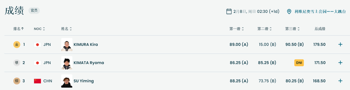 排名前二的选手都是来自日本,木村葵来发挥更为出色,第一跳89.00分、第二跳85.25分、第三跳90.50分,最终成绩锁定在179.50分,获得第一名,木俣椋真总分171.50分获得银牌。