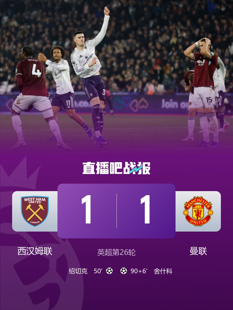 英超第26轮西汉姆联1-1曼联,绍切克进球,舍什科补时扳平。