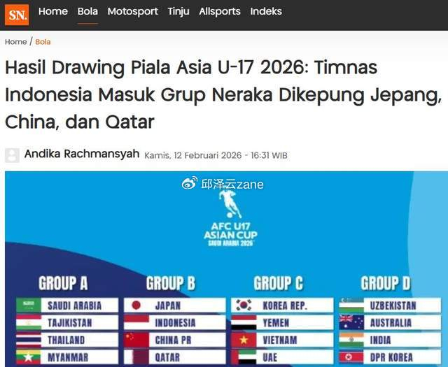 印尼媒体的标题写的是,《26年U17亚洲杯抽签结果:印尼被分到死亡之组,同组对手包括日本、中国和卡塔尔》,印尼说这是绝对的死亡之组,这支年轻的印尼U17要在B组面对重多强队,这是巨大挑战,特别是最近2次与中国队热身赛战绩非常不理想,分别以0比7和2比3输球。