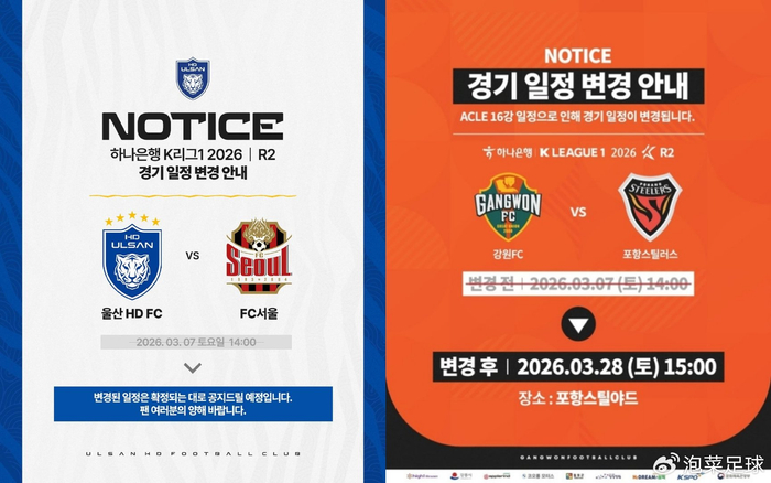 2、为亚冠让路,第二轮两场K1联赛延期至3月底进行